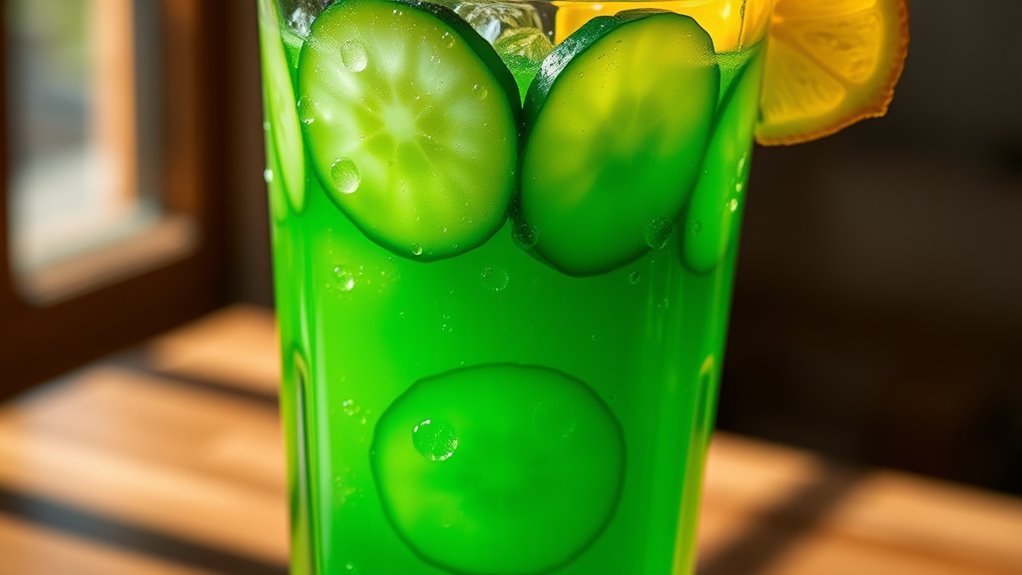 You can quickly banish bloating with this simple 2-ingredient juice using cucumber and ginger, both backed by their natural anti-inflammatory properties that promote hydration and ease digestion for relief in just 15 minutes. Blend one cucumber and a thumb-sized piece of ginger with water, strain, and drink it on an empty stomach for best results. Stay hydrated and add light exercise to enhance effects. Further insights on preparation and variations await.