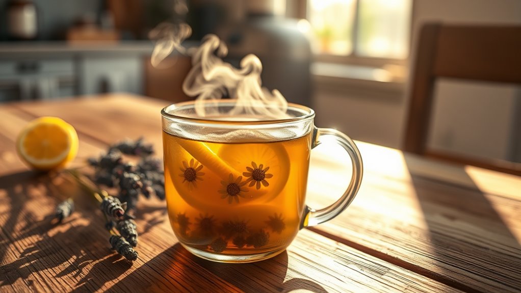 After preparing your herbal tea, you can enjoy how chamomile and lavender naturally ease anxiety by promoting relaxation and improving sleep quality, thanks to their anti-inflammatory and calming compounds that support overall well-being.