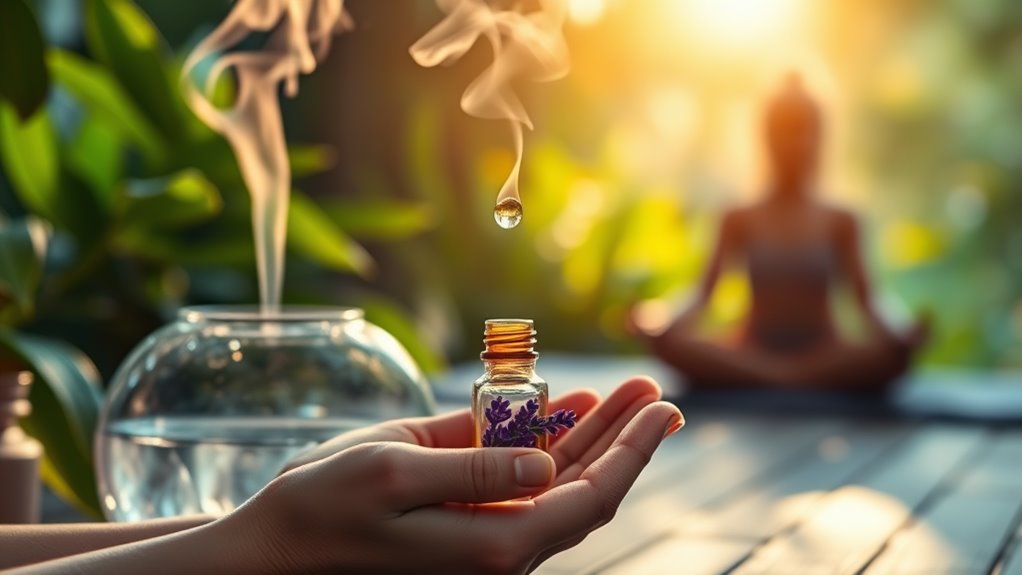 Incorporating these oils into your practice can enhance your breathing exercises significantly. Choose calming scents like lavender or chamomile, and add a few drops to your diffuser. As you breathe deeply, let the aroma envelop you, promoting relaxation. You can also apply diluted oils to your wrists or neck for a soothing effect throughout the day. Remember, consistency is key. Adding essential oils like lavender can provide natural pain relief and further enhance your overall sense of well-being.