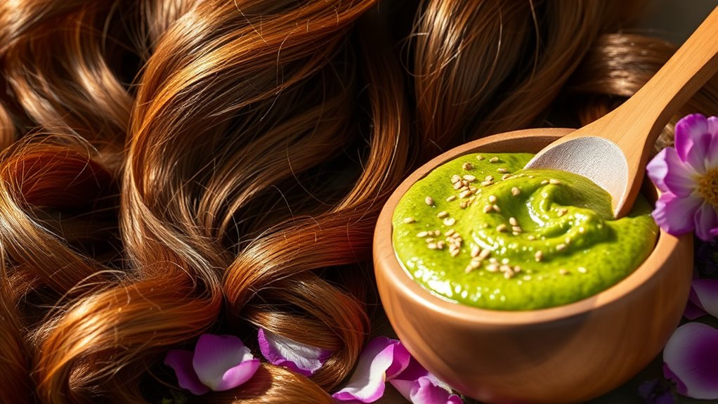 As you rinse out the herbal hair mask, you’ll likely notice an immediate boost in shine that makes your hair look vibrant. You’ll also feel the enhanced softness, making it easier to manage and style. These immediate effects can leave you excited about your hair’s transformation! Additionally, incorporating natural ingredients into your routine can lead to remarkable overnight DIY hair treatments that improve overall hair health over time.