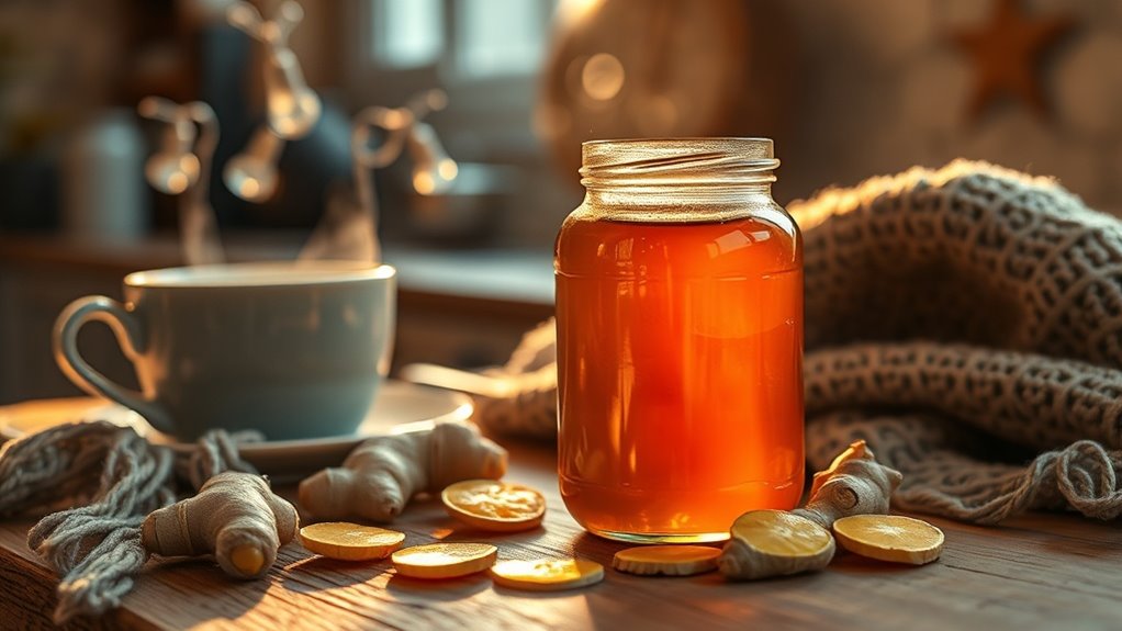 To create a soothing honey remedy, you’ll need just a few simple ingredients that boost honey’s natural effectiveness. Combine honey with some warm water, lemon juice, and a pinch of salt. Here’s how: