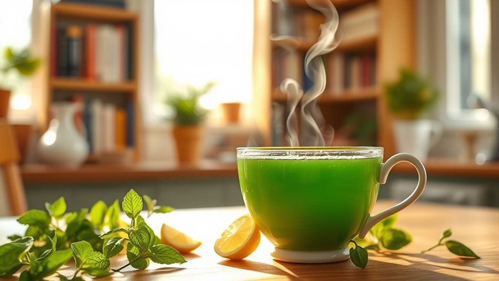 Finally, green tea provides a gentle caffeine boost, enhancing focus without jitters. Together, these herbal ingredients create a synergistic blend, helping you stay sharp and engaged throughout your day. Incorporating superfoods for clarity into your diet can significantly enhance your overall mental performance.