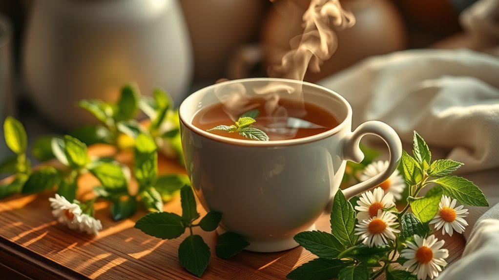 You benefit from these effects by incorporating them into your routine; peppermint’s menthol cools inflammation, while chamomile’s flavonoids enhance serotonin, making you feel lighter and more relaxed overall. Additionally, these ingredients are known for their natural remedies for nausea, providing further relief from digestive discomfort.